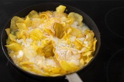 - Rehogar medio puerro en una sartén con un poco de aceite, una vez este, añadir las patatas fritas y un chorrito de vino blanco, añadir un poco de agua, con un poco de nata ( una parte de agua por media de nata) dos cucharadas de mostaza y pimienta, cocer hasta que la patata este blanda.