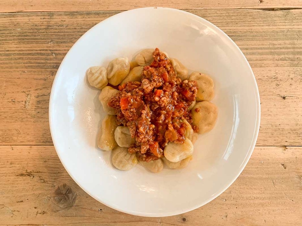 - Ponemos los gnocchis en el plato, la boloñesa por encima y rociamos con la salsa Orange French, rallar el queso parmesano por encima.